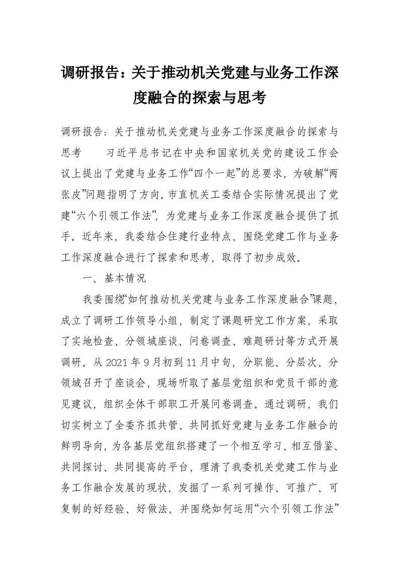 调研报告:关于推动机关党建与业务工作深度融合的探索与思考