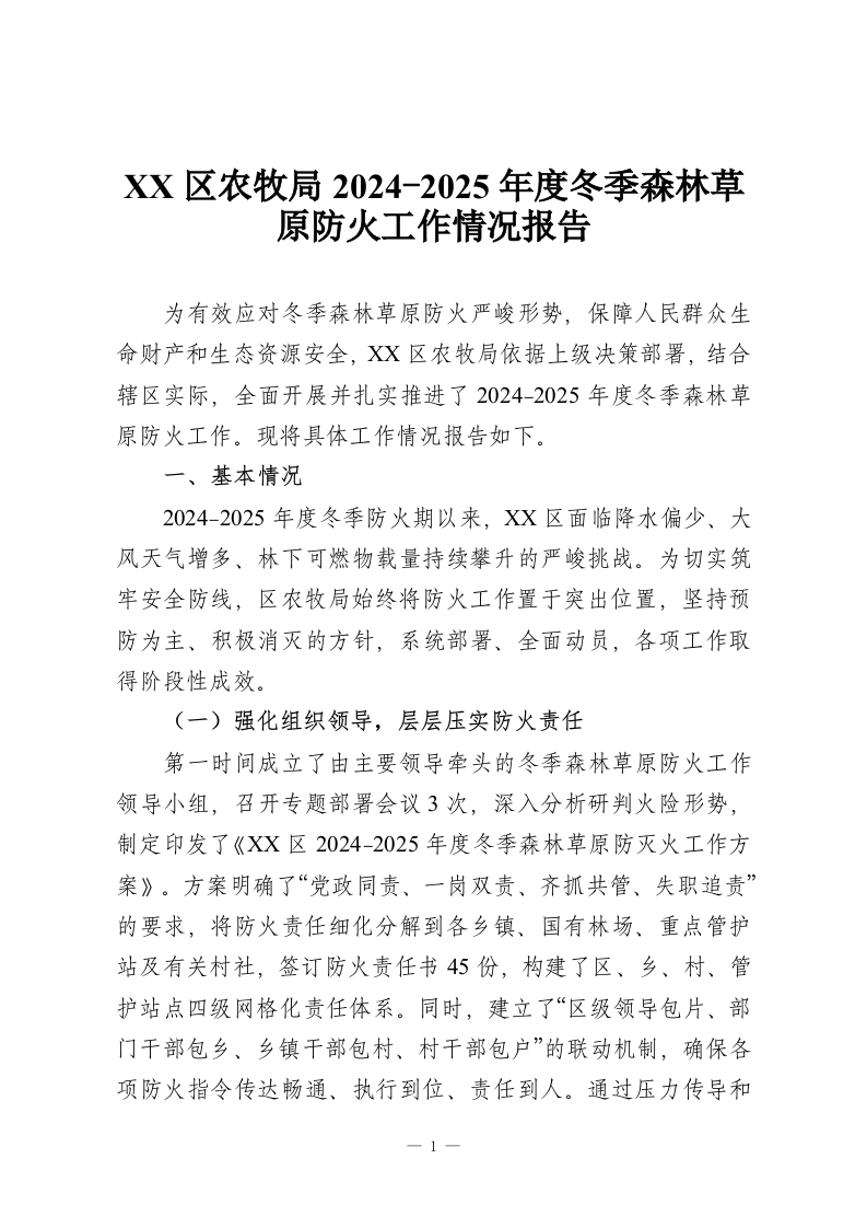 XX区农牧局2024-2025年度冬季森林草原防火工作情况报告