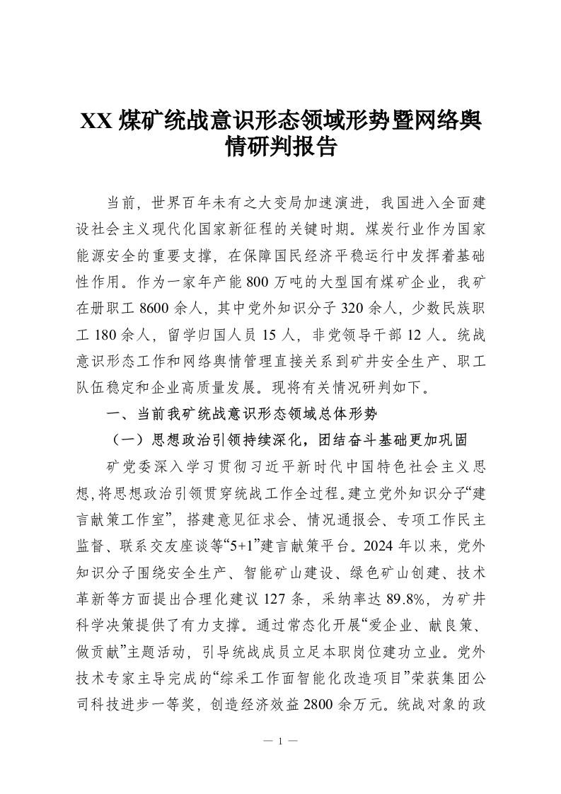 XX煤矿统战意识形态领域形势暨网络舆情研判报告