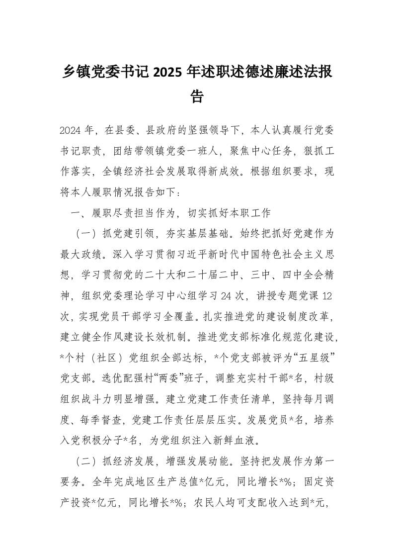 首页写作素材乡镇党委书记2025年述职述德述廉述法报告