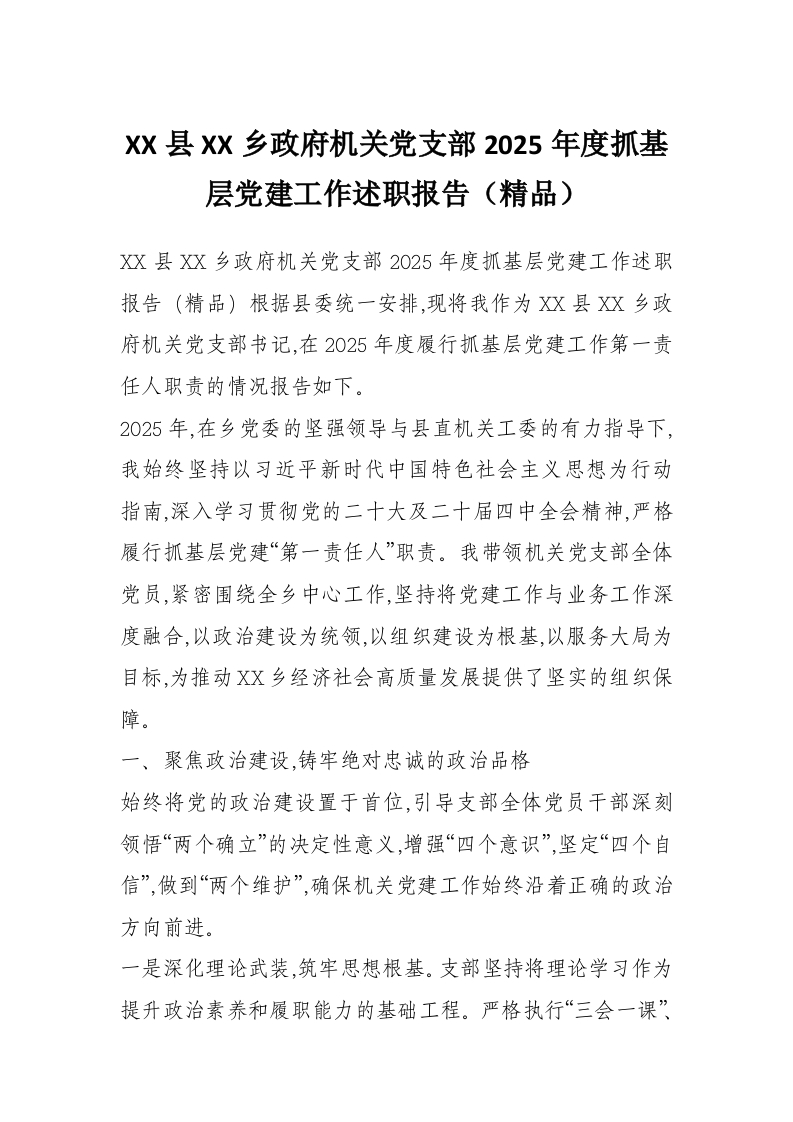 首页材料汇编XX县XX乡***机关党支部2025年度抓基层党建工作述职报告(精品)