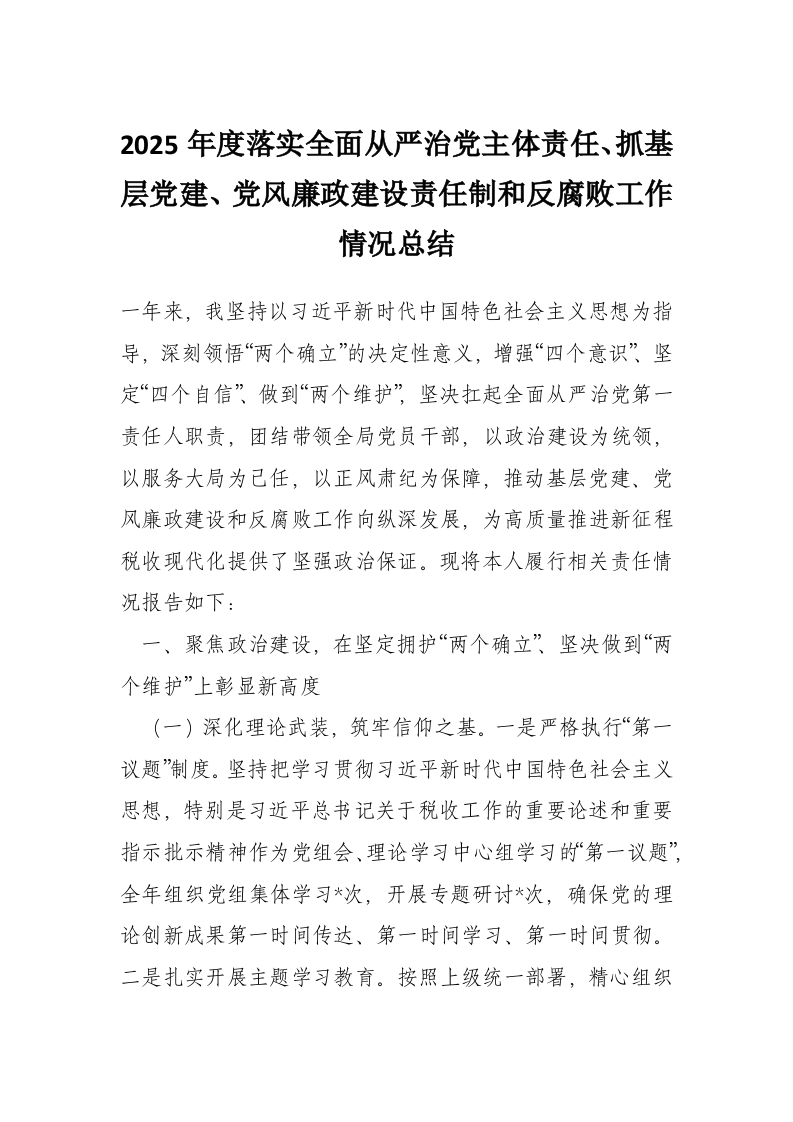 2025年度落实全面从严治党主体责任、抓基层党建、党风廉政建设责任制和反腐败工作情况总结