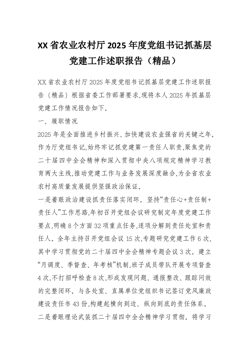 XX省农业农村厅2025年度党组书记抓基层党建工作述职报告(精品)